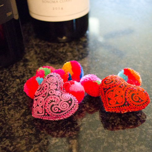 (Clockwise from top left: Hearts and pom poms handcrafted by the Hmong people of Thailand | Facts about refugees curated by our local, first-grade Girl Scout troop | Dessert trays displayed on Ankara fabric | Tiny hearts made from a map of Southeast Asia.)